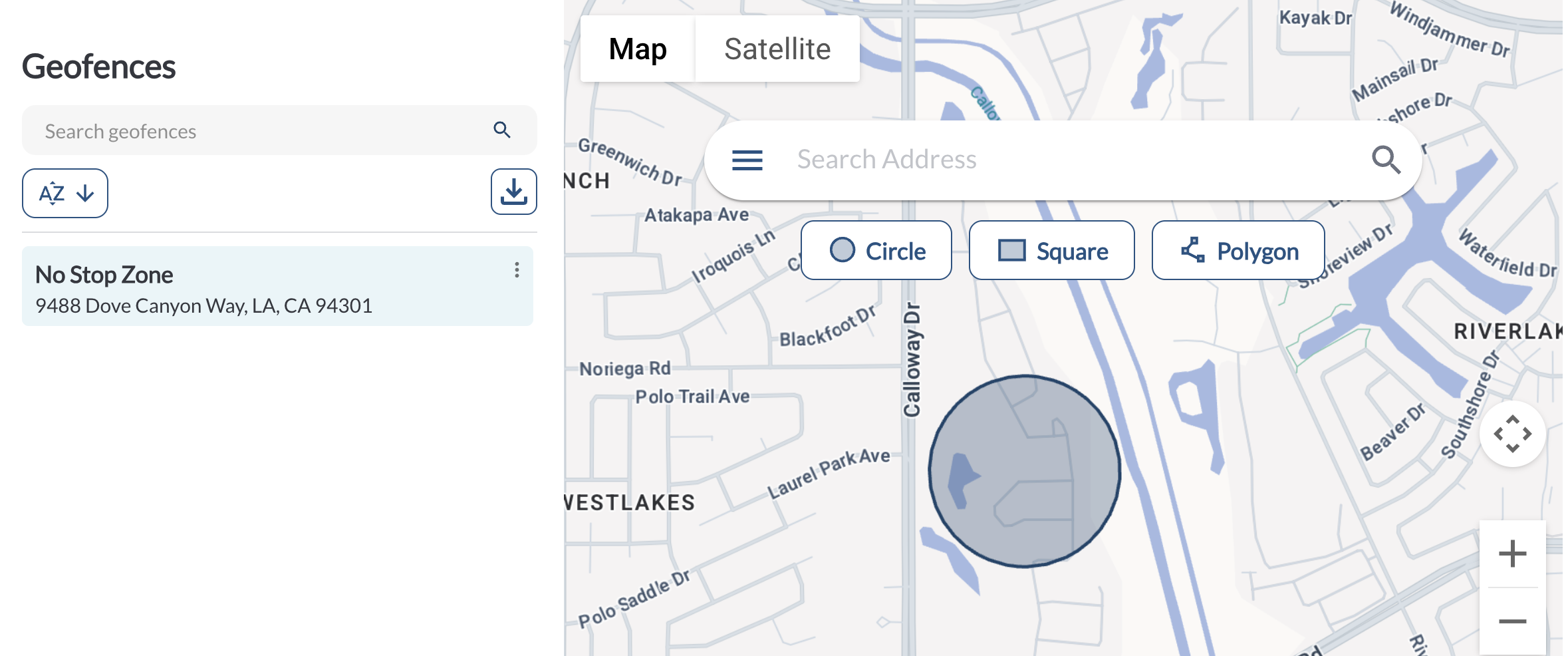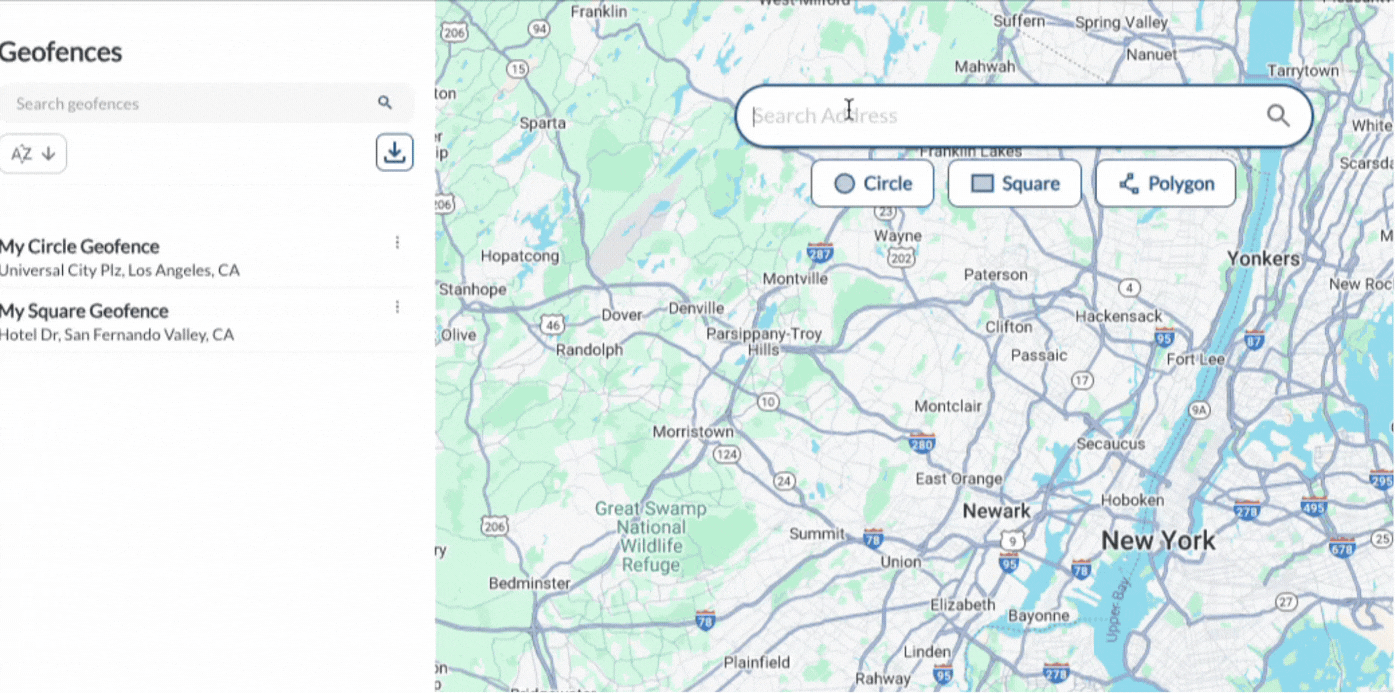 The Map Section is where you create geofences. You can choose from three geofence shapes and interact with the map to define their boundaries.