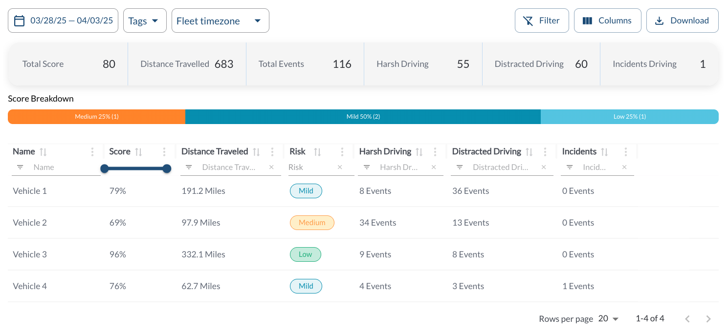 The table displays all the vehicle's safety events, allowing you to efficiently organize and access the details. It supports downloading, sorting, filtering, resizing columns, and other customization options. For a complete guide, read the article How to Use Table Options.