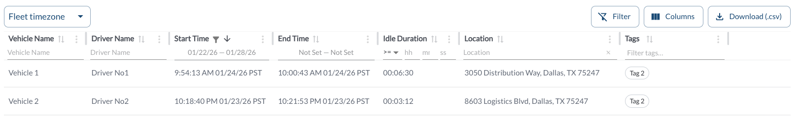 The Idling Event Report captures detailed information about each idling event in your fleet in the selected date range. This report allows you to monitor individual instances of idling and identify patterns across drivers and vehicles.