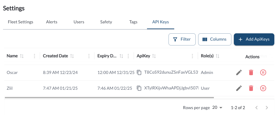 The API Key Settings tab allows users to manage API keys used for integrating external applications with the fleet management system. This tab provides tools to create, edit, and manage API keys securely while maintaining precise control over their usage.