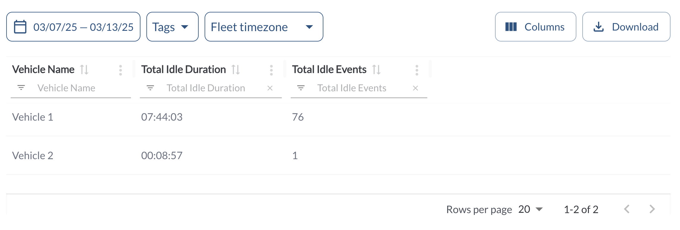 The table displays vehicles idling events activity, allowing you to efficiently organize and access the details. It supports downloading, sorting, filtering, resizing columns, and other customization options. For a complete guide, read the article How to Use Table Options.