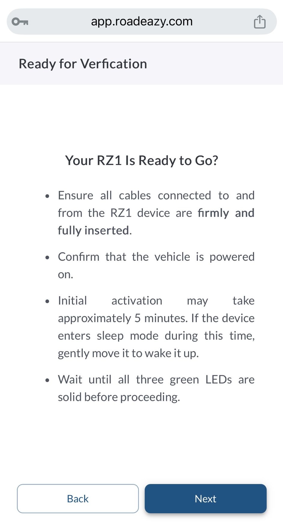 The RZ1 must be plugged into the vehicle, and the engine must be running. Please wait a few minutes before proceeding to the next step.