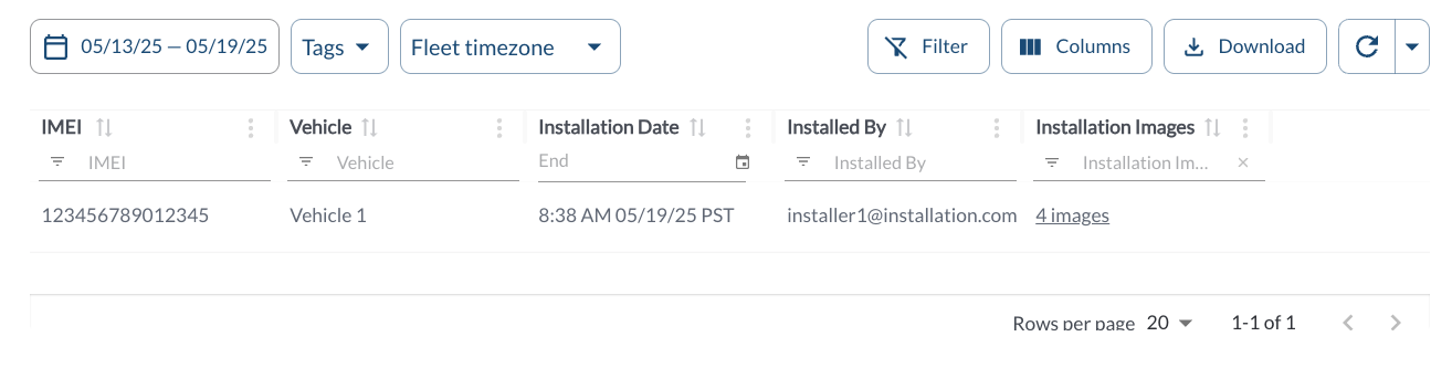 The Installation Report provides a record of all completed installations across the fleet within a selected date range. This report helps fleet managers and administrators verify successful installs, track installer activity, and review any attached documentation such as images.