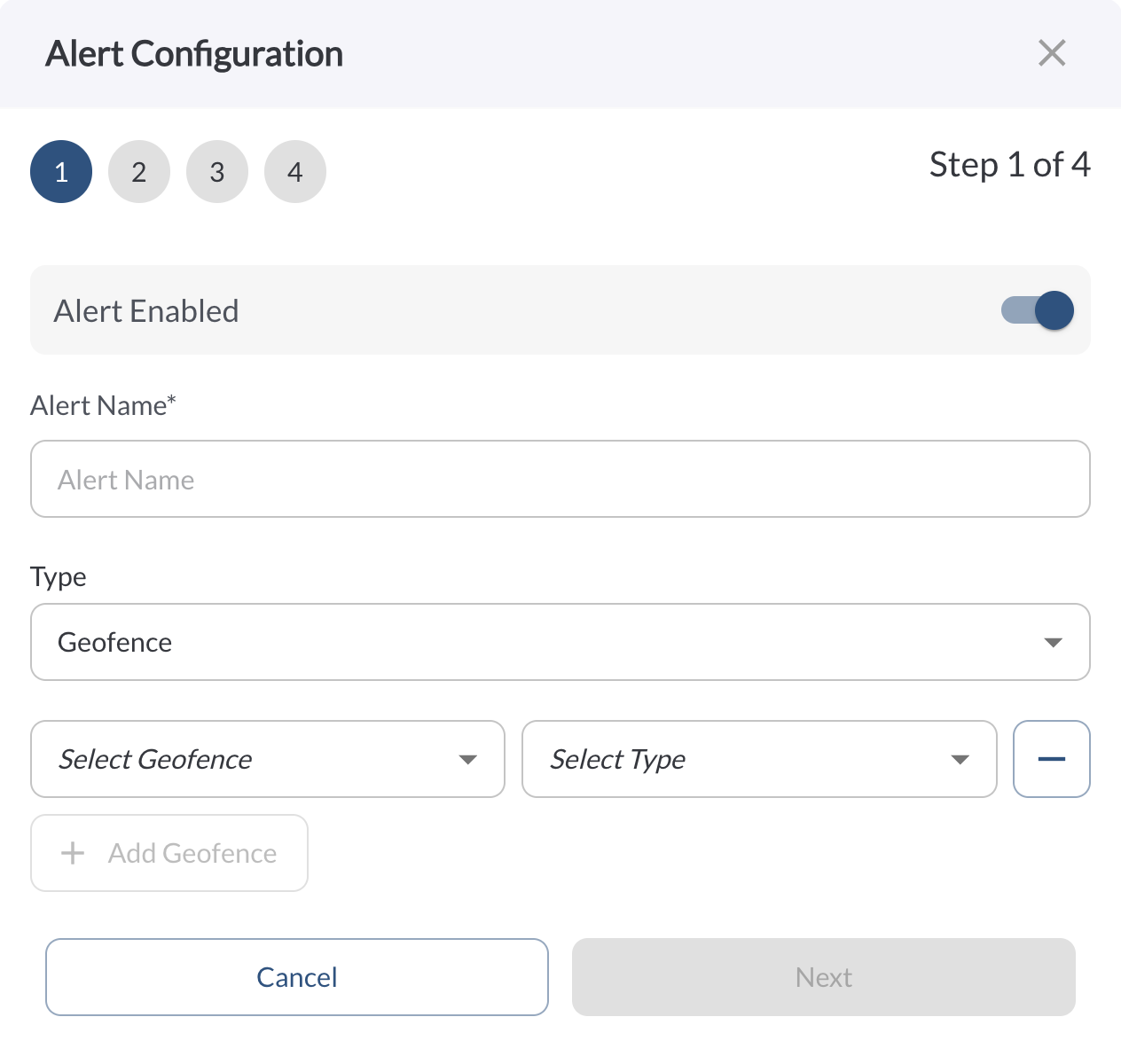 Triggers an alert when an asset enters or exits a designated geofence. You can configure which geofences should trigger the alert, limit it to specific time windows, and apply it to selected vehicles or tags. You can also assign which users should receive the alert when it’s triggered.