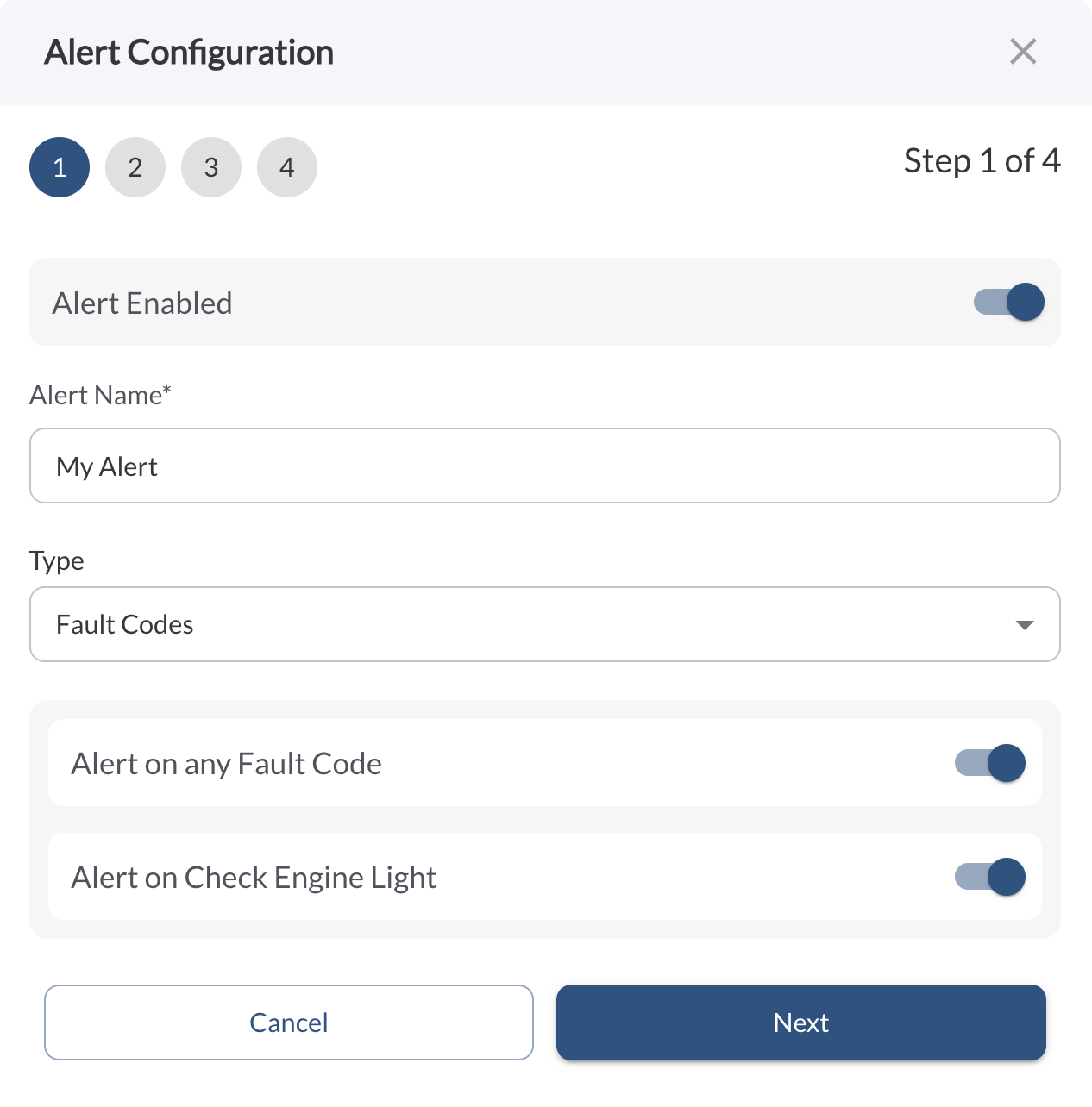 Triggers an alert when a fault code or check engine light is detected by the RZ1 device. You can enable alerts for any fault code and/or check engine light, limit them by geofence or time, apply them to specific assets or tags, and choose who should be notified.