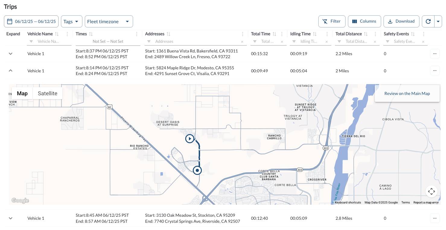 You can now view a small map preview directly from the Map > Trips table. Expand any trip row to see the route on a mini map. Click “View on Map” to open the full trip view on the main map, where you can explore additional trip data, including safety events and driving behaviors.