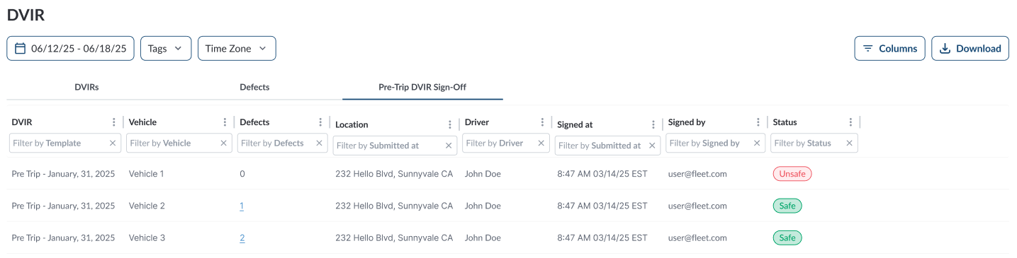 The table displays all Pre-Trip DVIR Sign-Off, allowing you to efficiently organize and access the details. It supports downloading, sorting, filtering, resizing columns, and other customization options. For a complete guide, refer to the article How to Use Table Options.
