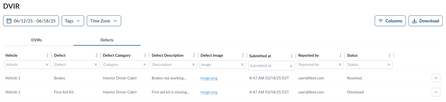 The Defects tab in the DVIR section of the Fleet Portal shows all reported issues from driver inspections. From here, fleet managers can review defect details, track their status, and mark them as resolved once the vehicle has been repaired or confirmed safe to operate.