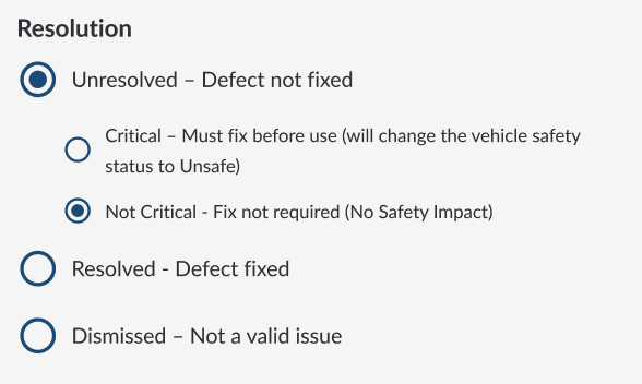 - Dismissed – Mark the defect as dismissed if it does not impact vehicle safety.
