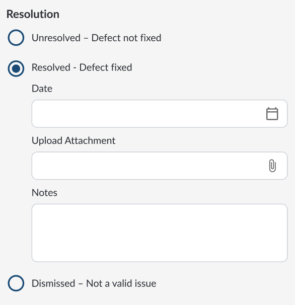 - Resolved – Add the resolution date, attachments (e.g., repair documents, photos), and notes to confirm the issue has been addressed.