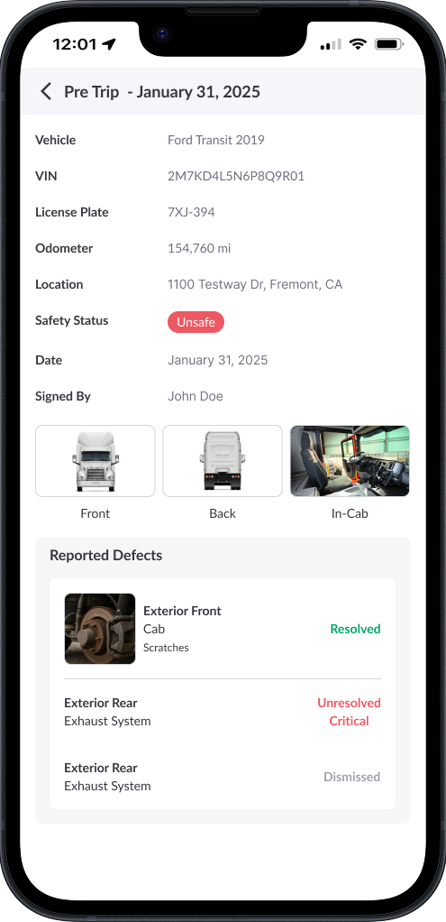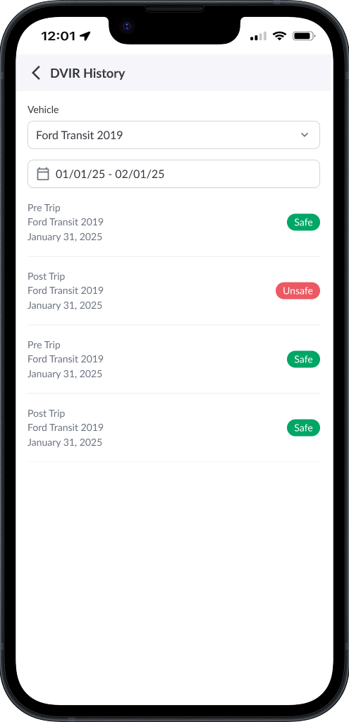 DVIR History lets you review past inspections, including vehicle details, safety status, and any reported defects.