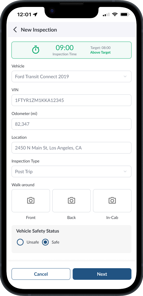 Fill Vehicle Details - If you are already checked in to a vehicle, the app will automatically pre-fill details such as Vehicle, VIN, Odometer, License Plate, and Location. Confirm that the information is correct before continuing.