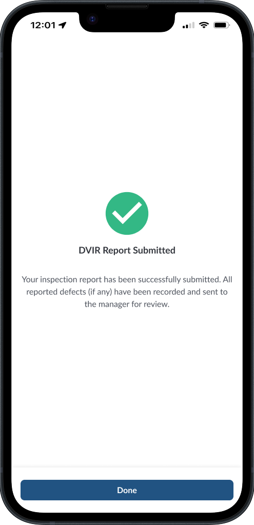Confirmation - After submission, you’ll see a confirmation screen that your DVIR report has been sent. Tap Done to return to the home page.