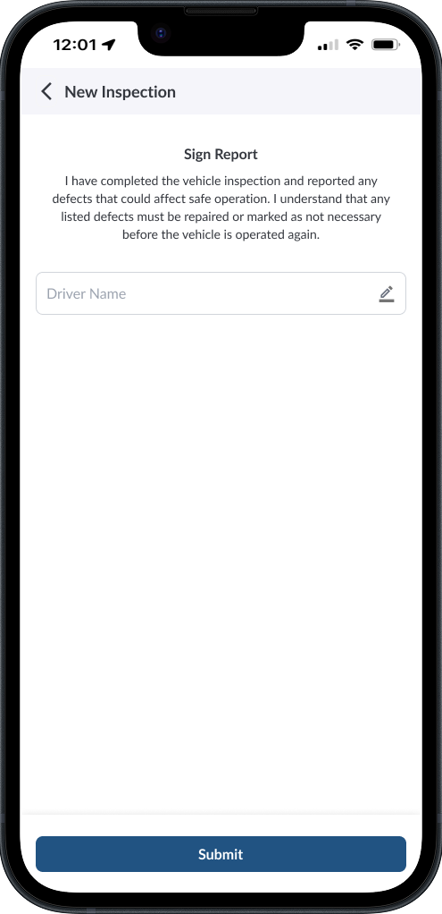 Sign and Submit - Once the inspection is complete, you’ll need to sign off on the DVIR to confirm its accuracy. Enter your driver name, then tap Submit to send the report. This finalizes the inspection and makes it available to your fleet manager for review.