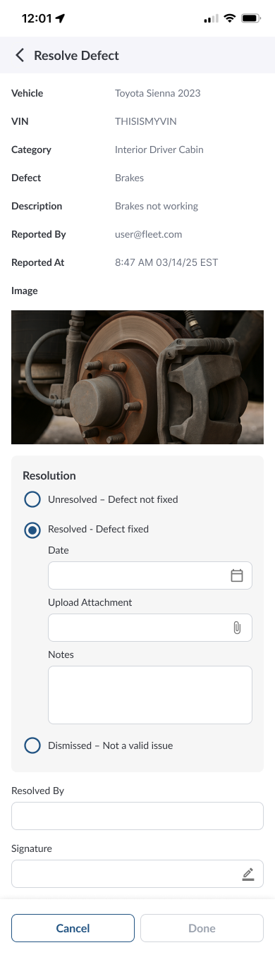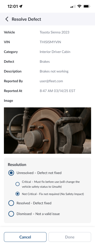 Defects reported in a DVIR can only be updated during the process of creating a new inspection, and only if your fleet manager has enabled this option. This ensures updates are tied to a valid inspection record and follow your fleet’s policies.