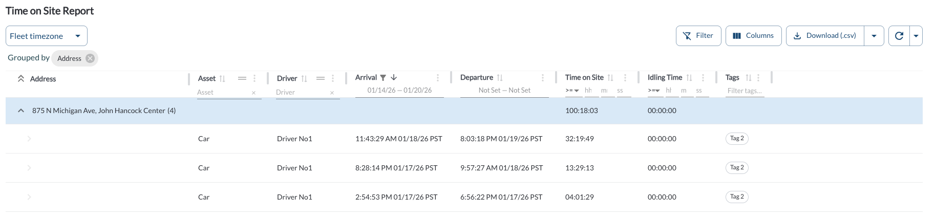 By default, the Time on Site Report table is grouped by Address, allowing you to see aggregated time on site and idling time for each location.