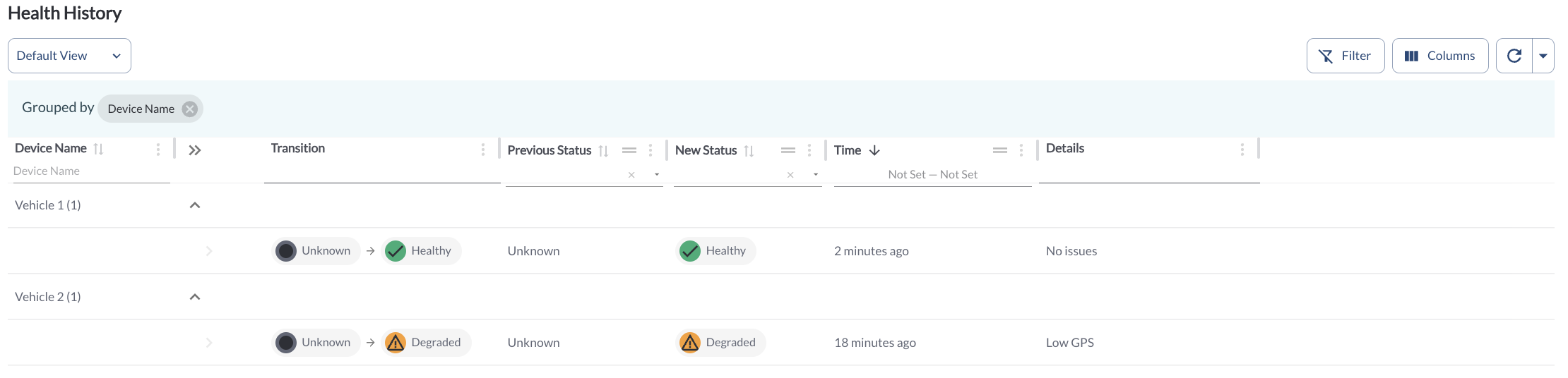 The Device Health section now includes a Health History page, providing a full log of all health status changes for each device. Each entry displays the status change and the reason it was triggered, giving fleet managers full visibility into the health timeline of their devices and making it easier to identify recurring issues or track resolution progress.